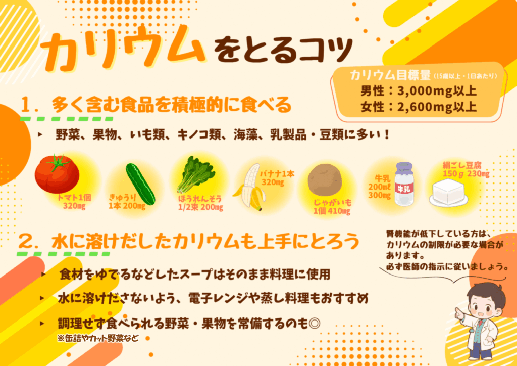 カリウムは先ほどご紹介しましたとおり、野菜や果物等に多く含まれますので、減塩とともにカリウムを含む食品を積極的にとりましょう。
