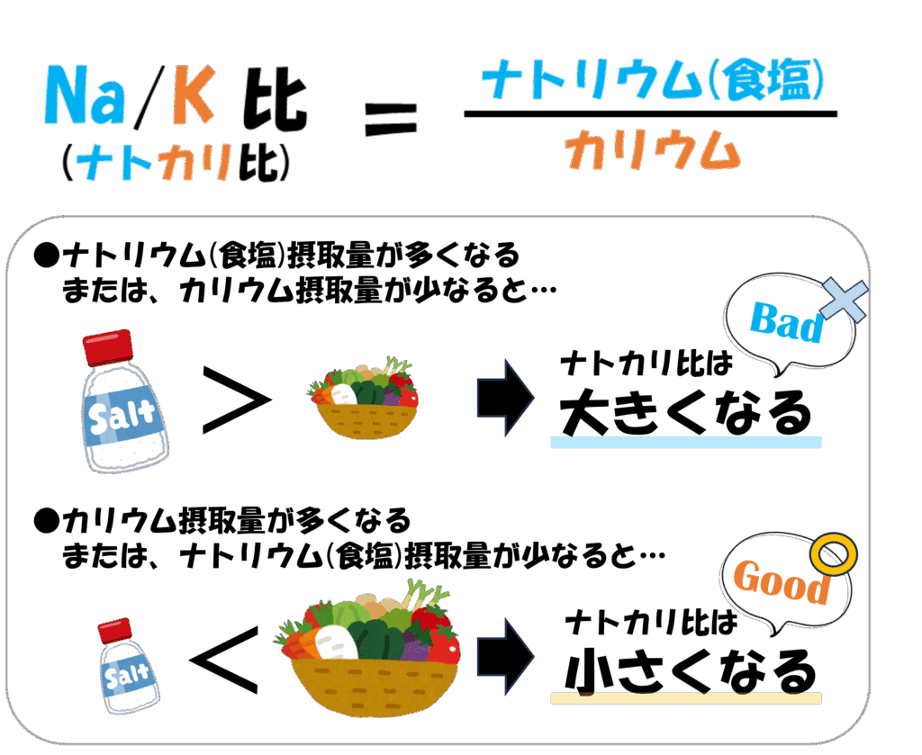 食事からナトリウム(食塩)を多く摂りすぎると、尿中のナトリウムが多くなり、ナトカリ比が上昇します。一方、食事からのカリウム摂取が多くなると、尿中のカリウムが多くなり、ナトカリ比は低下します。