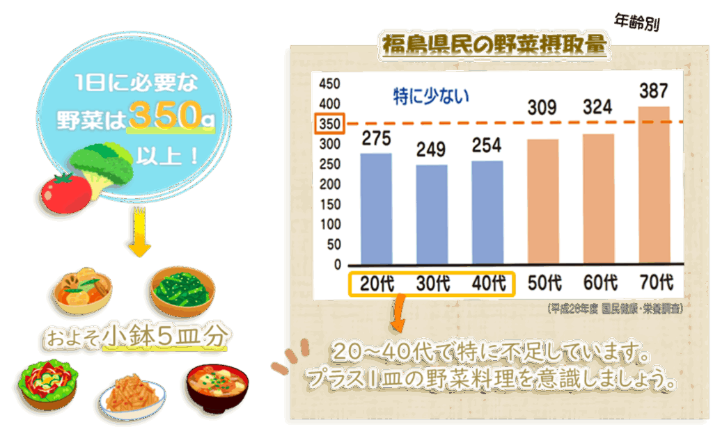 国の調査(平成28年国民健康・栄養調査)によると、福島県の方では20~40代で特に不足していることが分かっています。野菜の付け合わせは残さず食べる、毎食野菜を食べるなど、ご自身の現状に応じて、今より多く野菜を食べられるようにしましょう。