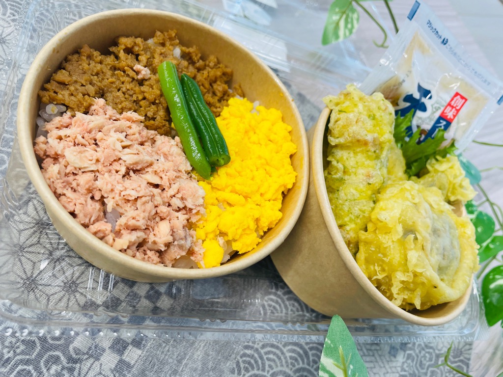 鶏そぼろ、鮭の焼きほぐしフレーク、玉子そぼろが織りなす三色丼と5種類の天ぷらを楽しめる贅沢な一品です。