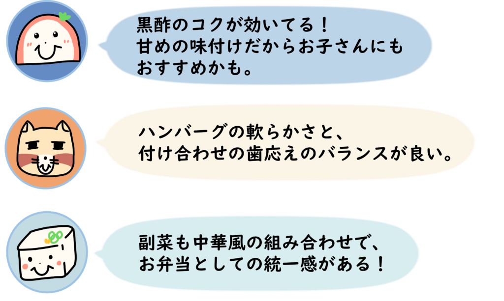 ハンバーグのたれには黒酢が使用され、その酸味とコクがくせになる味付けです。