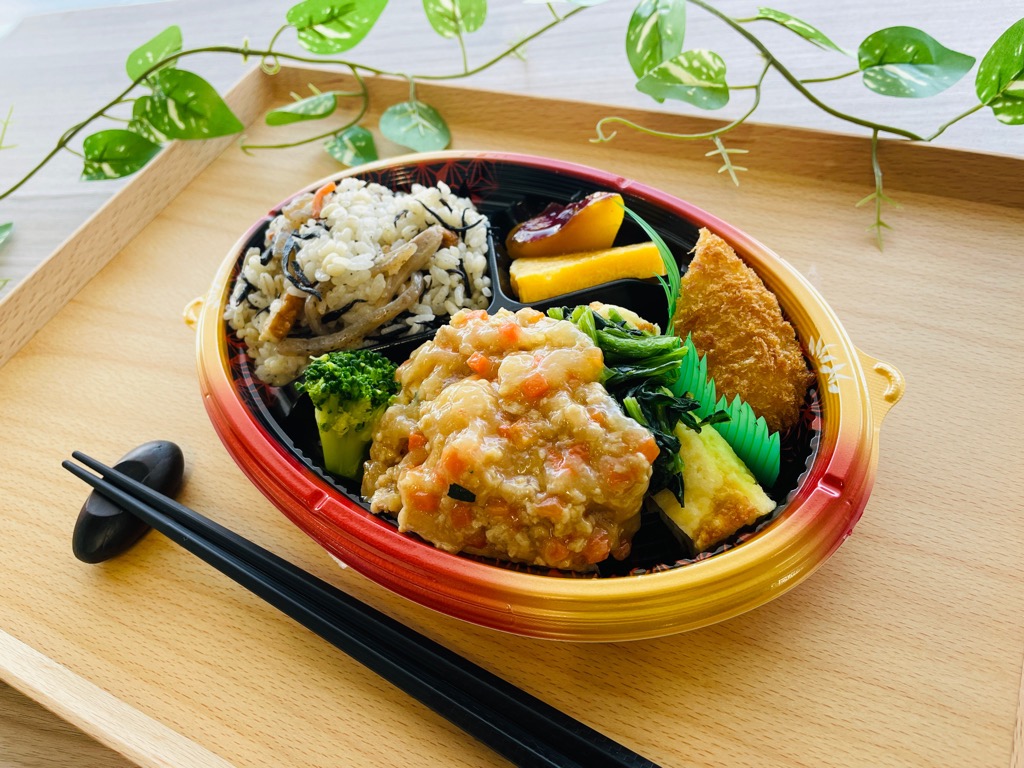 食べ応えのある揚げ出し豆腐にはたっぷりの鶏肉のあんがかかり満足感のあるお弁当です。